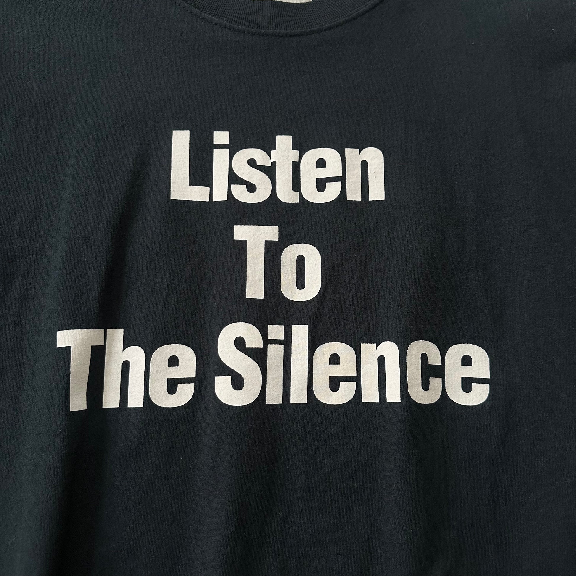 A black cotton t-shirt produced for Number (N)ine’s Spring/Summer 2002 runway presentation, printed on a vintage Anvil blank. Features the “Listen To The Silence” slogan across the front, with layered Number (N)ine and various branding graphics printed across the upper back. This tee was sold exclusively to attendees of the Spring/Summer 2002 runway presentation, rather than released through general retail.